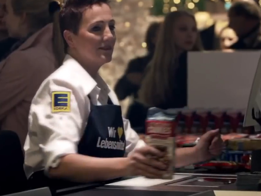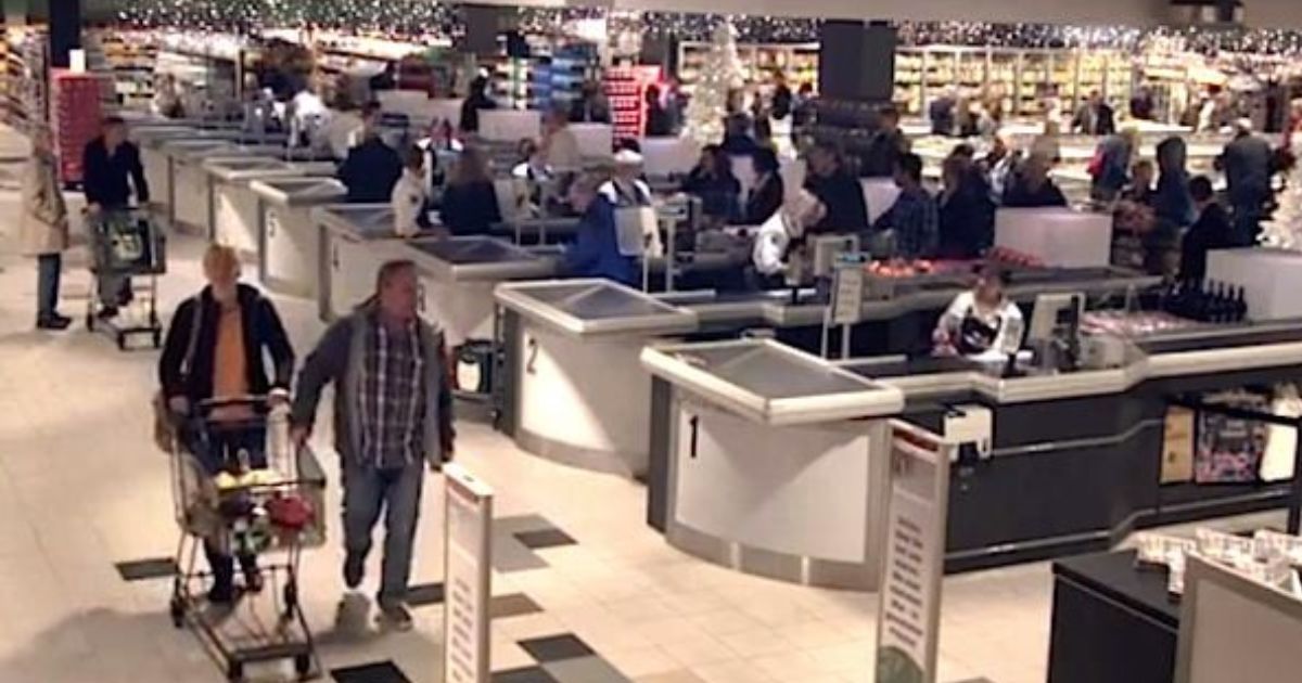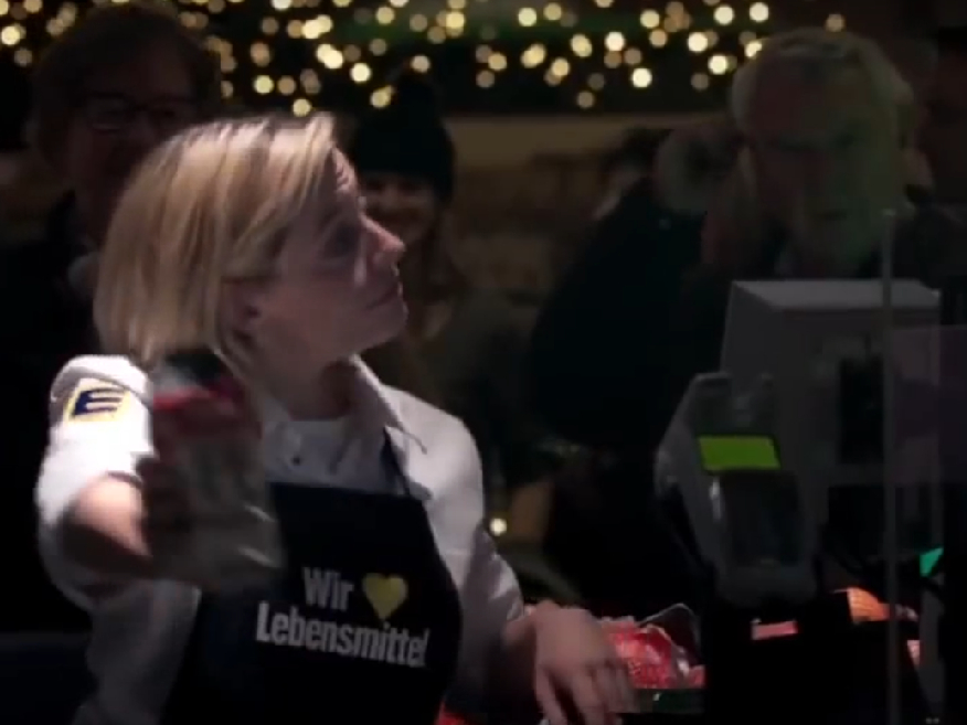The setting is a busy German supermarket where folks are doing their Christmas shopping.