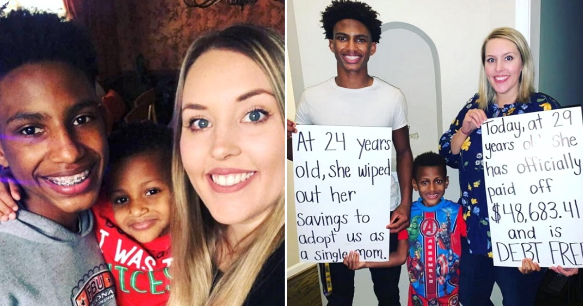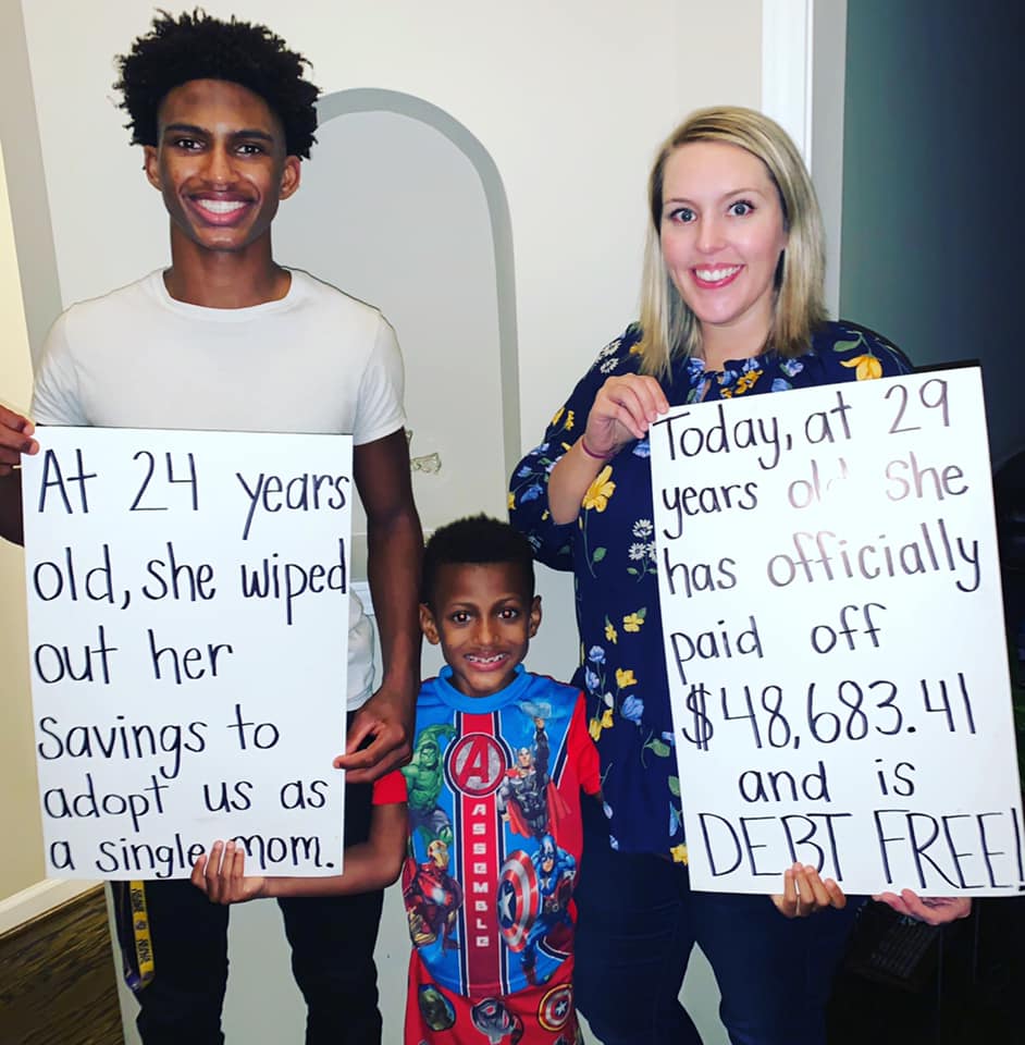 She shared a picture on her Facebook account that shows her posing with her family. On the left, Jerome holds a sign that reads: “At 24-years-old, she wiped out her savings to adopt us as a single mom”.
