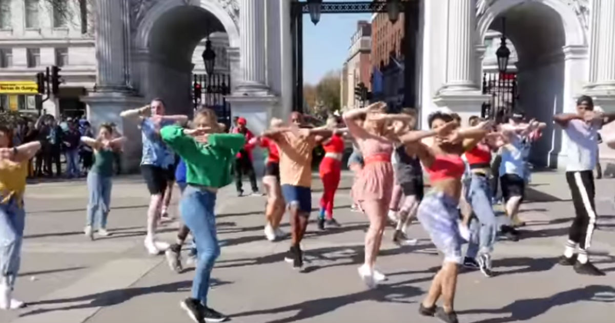 But the dancers weren’t just dancing. They were performing flips and cartwheels across the London streets. As imagined, they were drawing a crowd — and no wonder.
