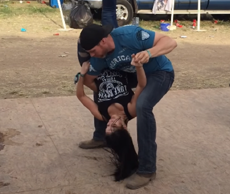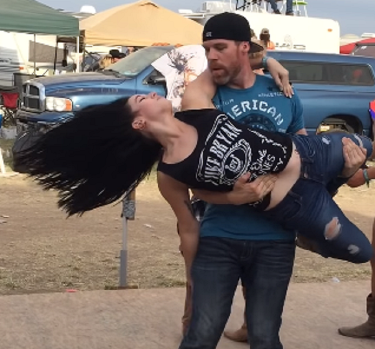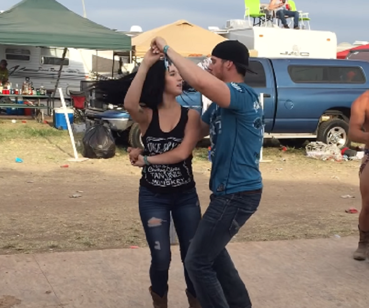 The beautiful woman is in skin-tight jeans, a sleeveless black top, and cowgirl boots, while the guy is in jeans and a blue shirt. No fancy costumes, but their moves are all they need to captivate the crowd.